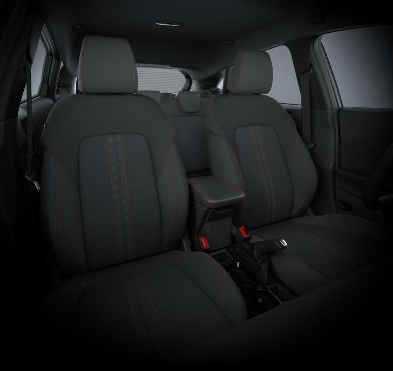 • Schwarzer Stoffbezug mit roter Naht